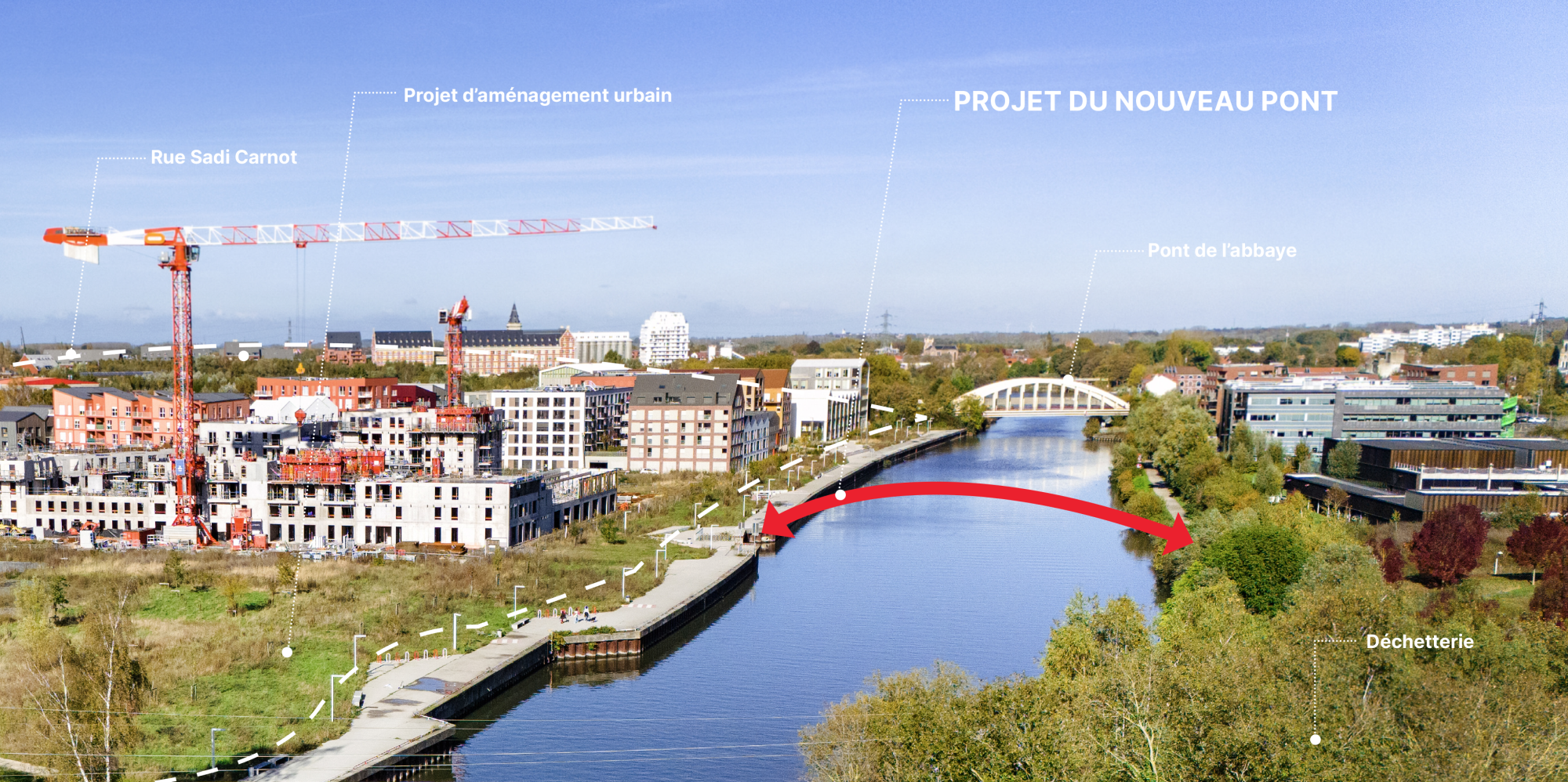La Métropole Européenne de Lille envisage de réaliser un nouveau pont sur la Deûle reliant les 2 rives au niveau des rues Sadi Carnot à Saint André-lez-Lille et Gustave Scrive à La Madeleine.