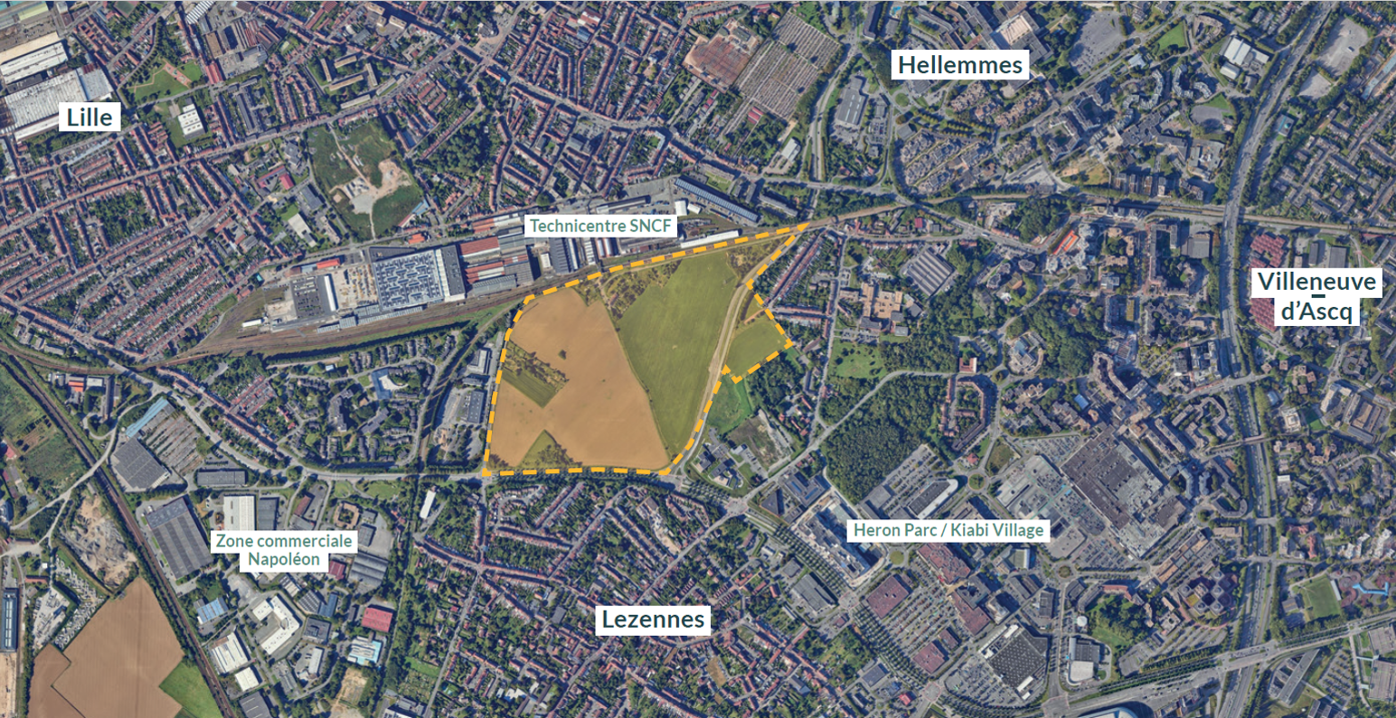 Zoom sur l'espace entre le siège de la SNCF, le Heron Parc, la ZI du Hellu