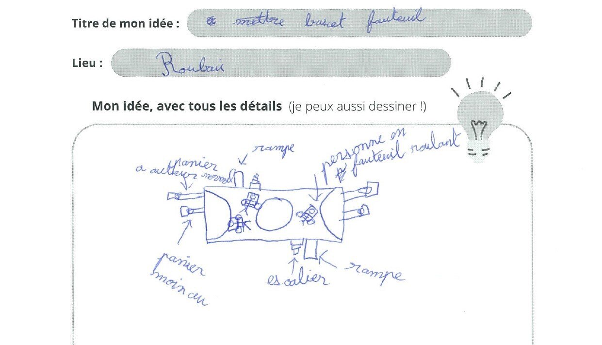 Adapter un terrain de basket au basket en fauteuil roulant, en le rendant accessible grâce à l’ajout de rampes pour compléter les escaliers et de paniers à hauteur adaptée.