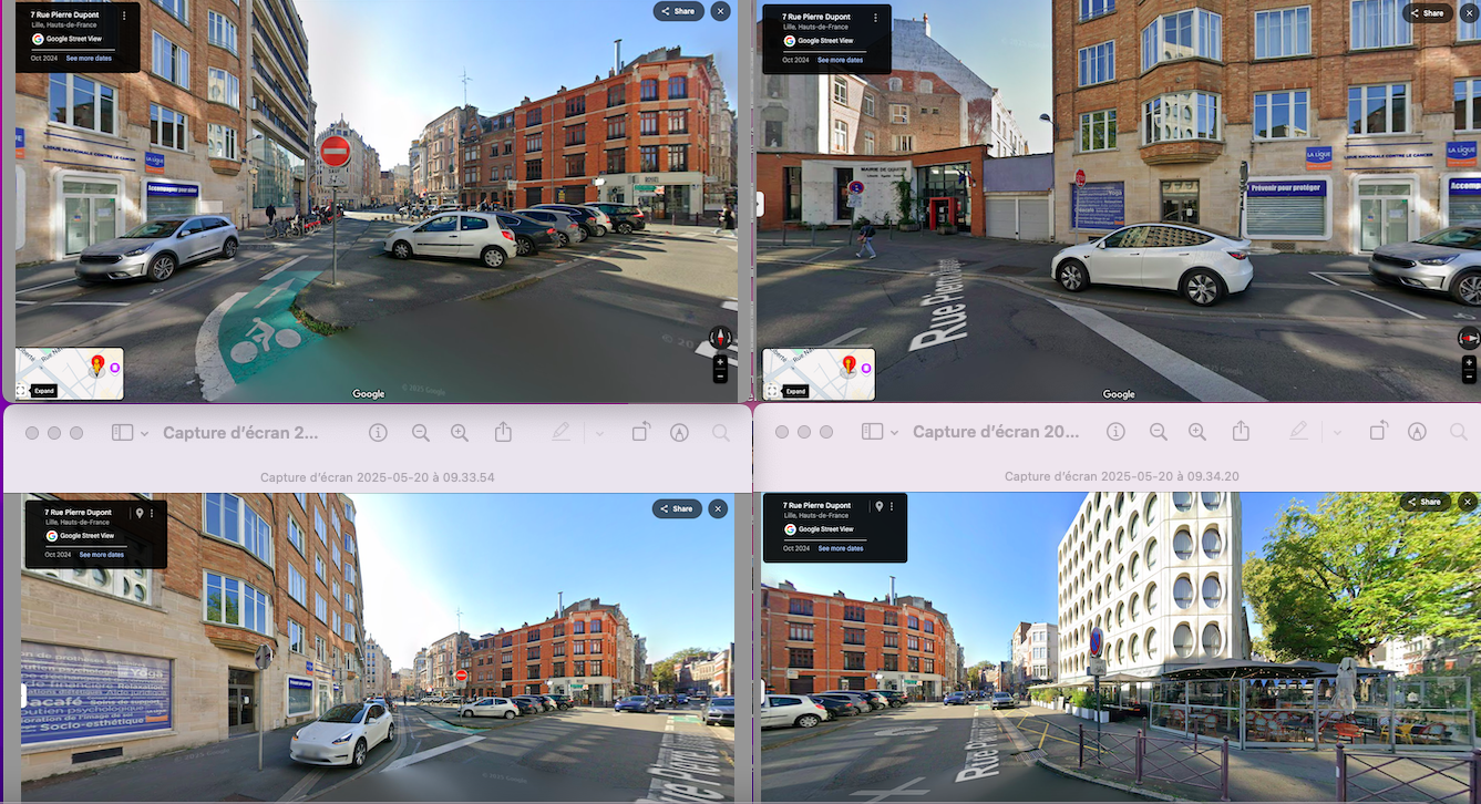 Toutes ces rues sont très fréquentées par les voitures et sans aucune verdure (à l'exception de 2 arbres cachés à l'ombre près de l'hôtel LE WHY. Je vis au 2-4 Rue Pierre Dupont et notre copropriété se désole de ne voir aucune trace de biodiversité
