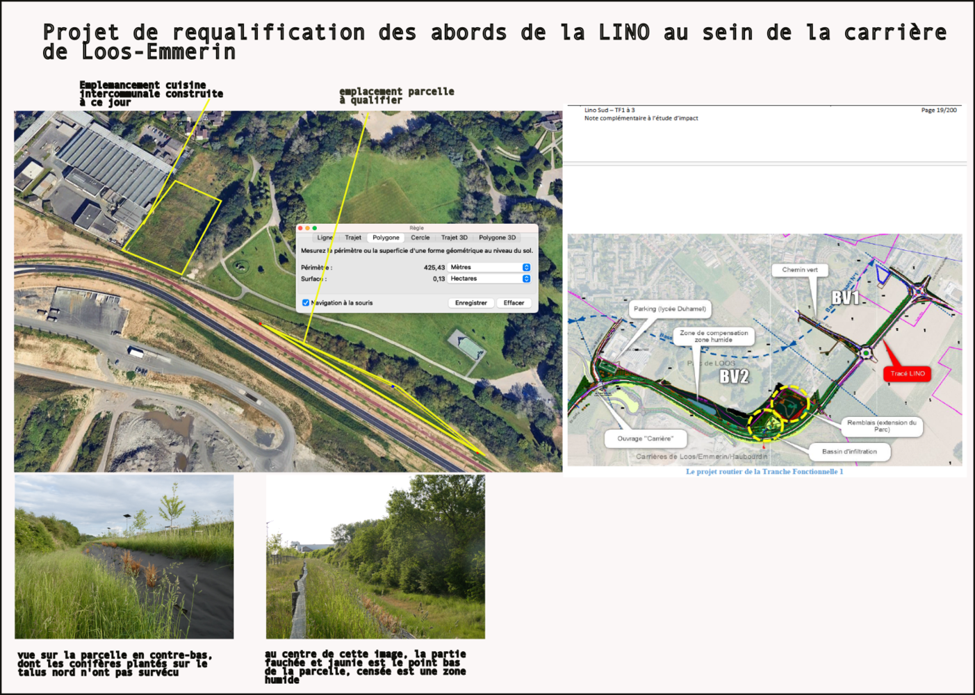 Il s’agit d’un espace entre le talus Nord de la LINO et le Parc Naturel Urbain de Loos, à la traversée de la carrière d’Emmerin. Cet espace présente un dénivellement profond et est bordé de deux flancs : - au Nord un apic qui se présente comme une falaise de craie revégétalisée spontanément qui borde le parc de Loos, - au Sud, le talus de la LINO, en pente un peu plus douce qui arrive au fond de cette excavation. Sa largeur est de quelques mètres (une bonne dizaine) Sa formation s’explique par l’apport du talus portant la LINO sur un fond de carrière excavé. Il se situe au dessus de l’ancienne route technique d’accès au site par l’exploitant, qui a été couverte de terre sur une certaine épaisseur. Le flanc sud de cet espace (talus de la LINO) a été planté par des conifères (choix tout à fait discutable) qui n’ont pas résisté à la sécheresse de ce printemps 2025 et feuillus. Cet espace a été désigné par les aménageurs de la LINO comme espace de compensation pour des impacts de la LINO sur une zone humide existante en bordure de Deûle.