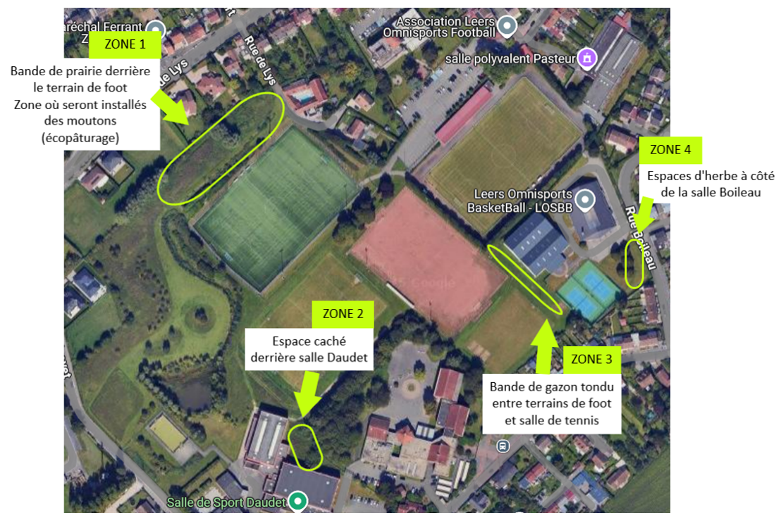 Voir le plan. Il y a plusieurs emplacements possibles, mais qui font plus de 3000 m2 en tout. Si notre projet est retenu, nous pourrons choisir ce qui est le mieux de réaliser. Surface : Prairie derrière le terrain de foot (Zone 1) : 3000 m2 maximum Espace derrière la salle Daudet (Zone 2) : 400 m2 Gazon entre la salle de tennis et le terrain de foot (Zone 3) : 500 m2 Espace d’herbe à côté de la salle Boileau (Zone 4) : 800 m2